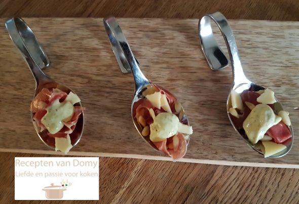Heerlijke hapjes met een romige zoute pesto smaak. Meng de mayonaise met de pesto. Zet een stukje ham op een amuse lepel. Verdeel pijnboompitten en kleine stukken kaas erop. Leg een toefje pesto mayonaise erop.