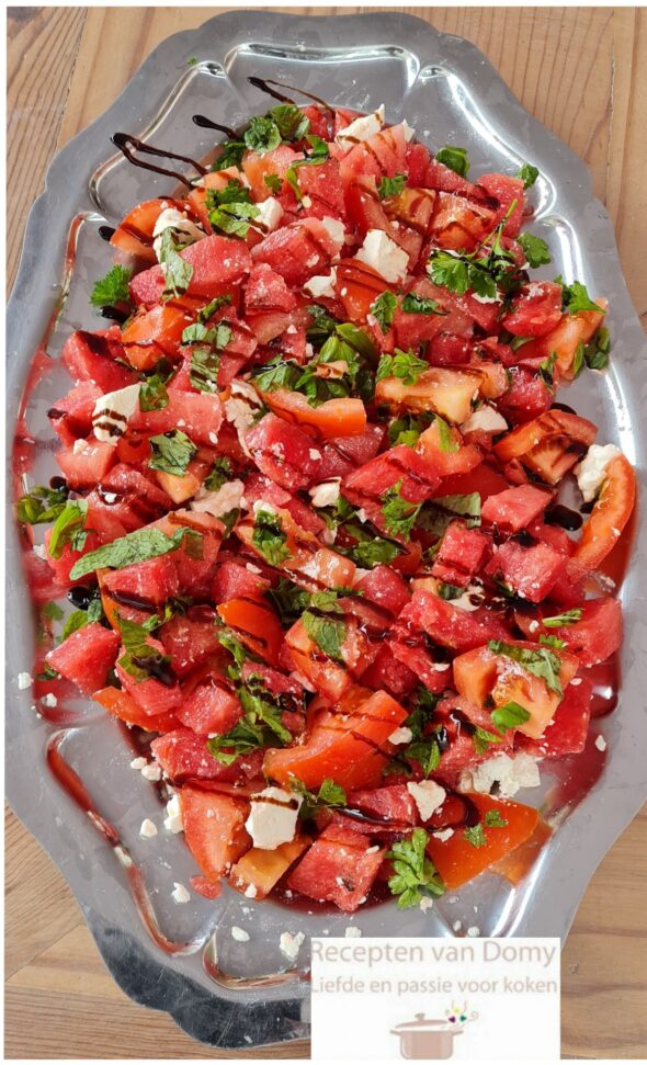 Heerlijke, frisse salade met watermeloen, tomaat, Feta en verse kruiden. Snijd de watermeloen in stukjes. Snijd de tomaten in blokjes. Verdeel ze op een serveerschaal. Scheur de feta en verdeel hem. Was de kruiden en verdeel en /of scheur ze boven de salade. Besprenkel met de créma di balsamico.