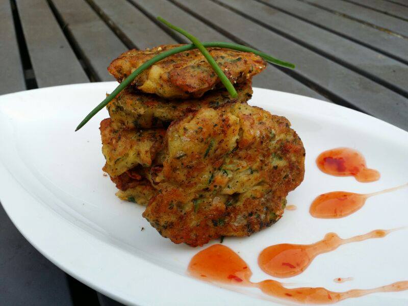 Rasp de aardappelen, de wortels en de courgettes fijn. Hak samen, de vis, de peterselie, de bieslook, de bosuitjes, de koriander, de ui en de knoflook heel fijn. Voeg samen de groenten, het vis mengsel, de bloem, de kruiden en de eieren en roer ze goed samen. Breng op smaak Lees verder...
