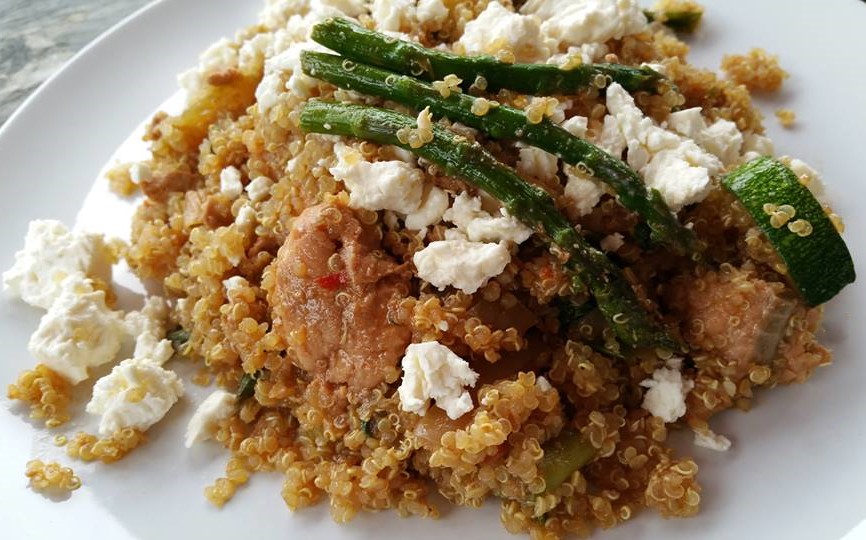 Healthy food recept. Snijd de uien in blokjes. Hak de knoflook en de Spaanse peper. Snijd de courgette in blokjes. Snijd de zalm filets in blokjes. Pers de gember bolletjes. Snijd de lente uitjes in ringetjes. Kook de quinoa in ruim water met zout. Giet de quinoa af. Verwarm Lees verder...