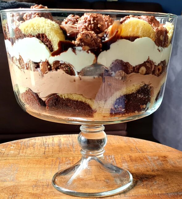 Kerstmis menu Zelfverzonnen trifle recept met opgeklopte mascarpone en nutella, slagroom, pecan noten, marbré cake, muffin chocolade en natuurlijk Ferrero rocher bonbons. Je kan het toetje een dag van tevoren maken. Je kan het toetje in kleine verrines (glaasjes)serveren of in een trifle bol. (grote glazen vaas op voet, hier Lees verder...