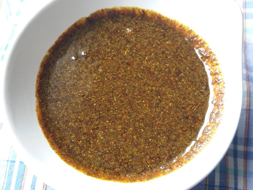Dit recept is geïnspireerd op dit van Jamie Oliver. Jamie gebruikt wel gedroogde kokos maar ik had het niet in mijn voorraadkast. Snijd de Spaanse peper in ringetjes. Snijd de knoflook, de koriander en gember heel fijn. Pureer alle ingrediënten of maak ze fijn in een vijzel. Breng op smaak met peper.