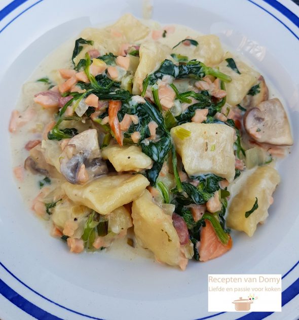Maak de zelfgemaakte gnocchi klaar. Kook ze in ruim water met zout en 1 lepel olijfolie. Ze zijn klaar wanneer ze drijven boven het water. Giet ze af. Snijd de uien in blokjes. Hak de peterselie en de knoflook fijn. Snijd de zalm in reepjes. Halveer de champignons. Rasp de Lees verder...