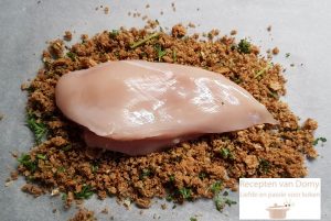 Hak in een keukenmachine de brood, de peterselie en de knoflook. Breng op smaak met peper en zout. Leg op de aanrecht een bakpapier. Doe een soeplepel brood en zet de kipfilet bovenop. Strooi wat brood bovenop en bedek met een nieuw vel bakpapier. Met een roller sla op de Lees verder...