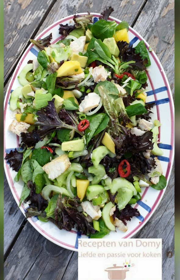 Heerlijk met Pinda dressing erbij. Verwarm in een koekenpan, 1 eetlepel Olijfolie. Bak de tonijn stukken, 3 minuten, beide kanten. Laat ze afkoelen en snijd ze in blokken. Snijd de Spaanse peper, het ui en de bos uitjes in ringetjes. Snijd de avocado’s in blokjes. Snijd de mango’s in blokjes. Lees verder...