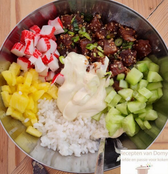 Recept voor 2 persoon. Kook de sushi rijst in ruim water, giet Hem af. Meng de rijstwijn azijn en zet in de koelkast om af te koelen. Verwarm de olie in een pannetje. Verwarm de sesam zaden tot ze goudbruin worden. Snijd de tonijn stukjes in mini blokjes. Snijd de Lees verder...