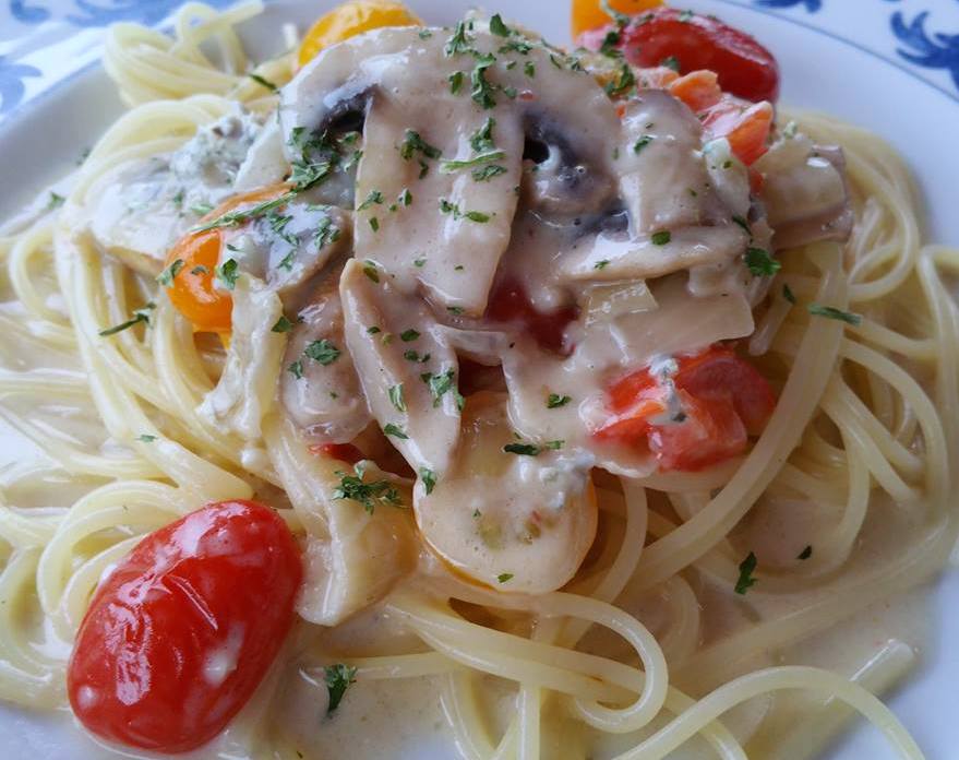 Spaghetti met Gorgonzola, tomaatjes, champignons saus