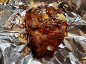 Haal de spareribs uit de barbecue en verwijder voorzichtig de folies.