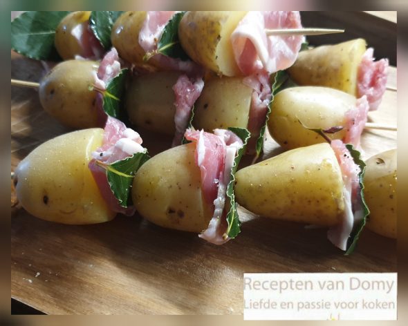 Prik een stuk aardappel en plaats tussen elke stukje,  een stuk ontbijtspek en dan 1 laurierblad.