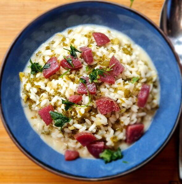 Serveer de risotto met wat krokante salami en eventueel wat plakjes gerookte worst.