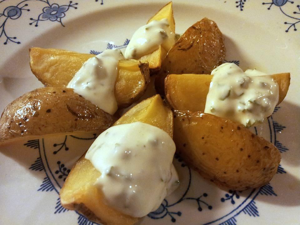 Verdeel de aardappels in een serveerschaal en giet de saus eroverheen.