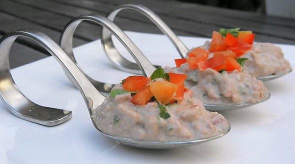 Vul de lepels met het crème-paté en garneer ze met stukjes paprika en peterselie.