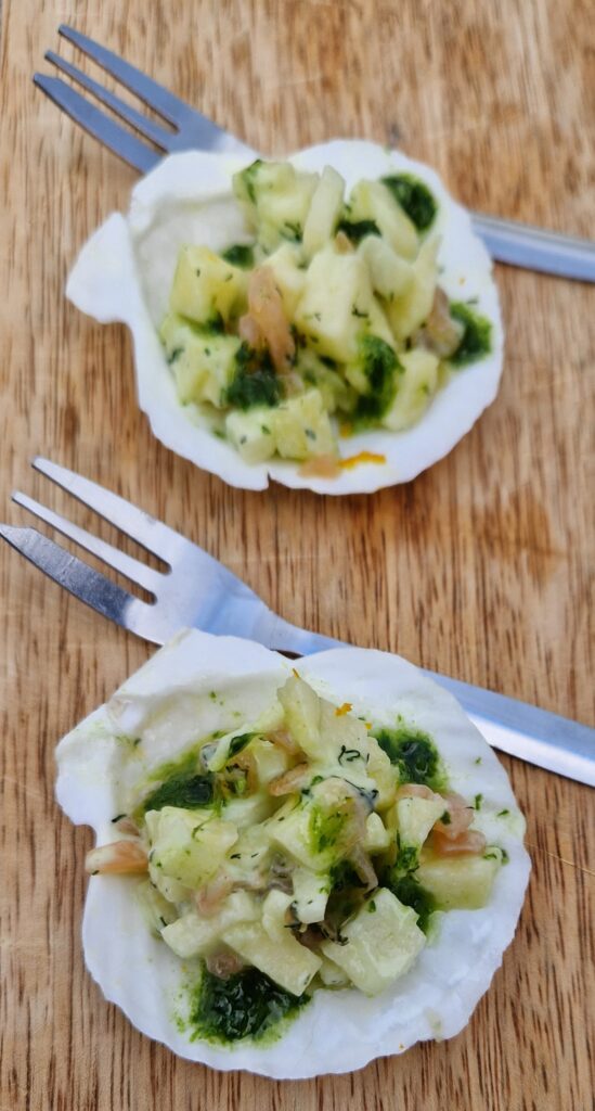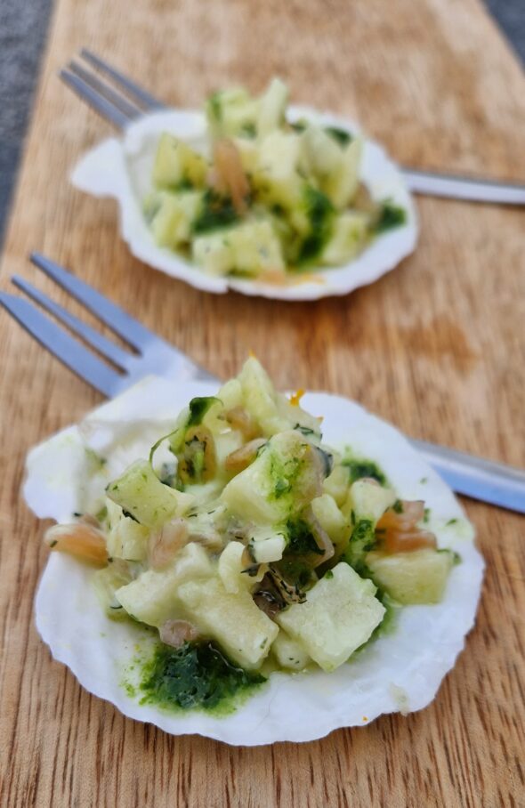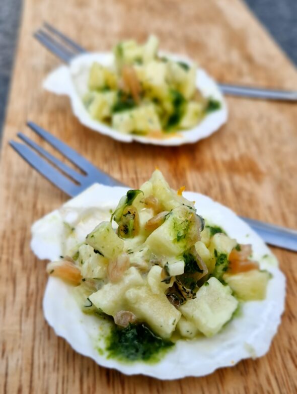 Mooi geserveerd in amuse bakje of mini coquille schelpen.
