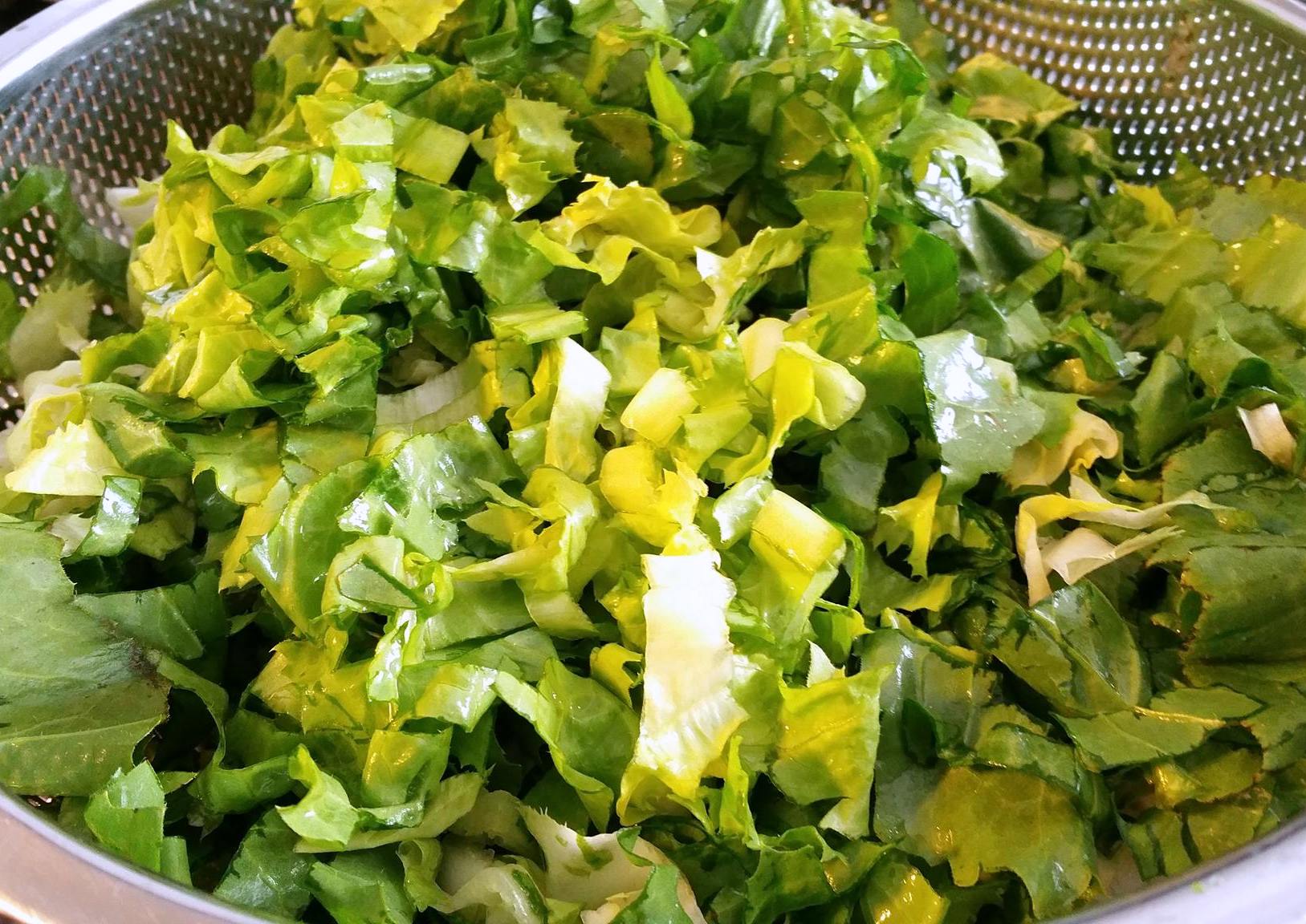 Schep de andijvie met de tonijn, de tomaatjes, de olijven en de pijnboompitten door de puree.