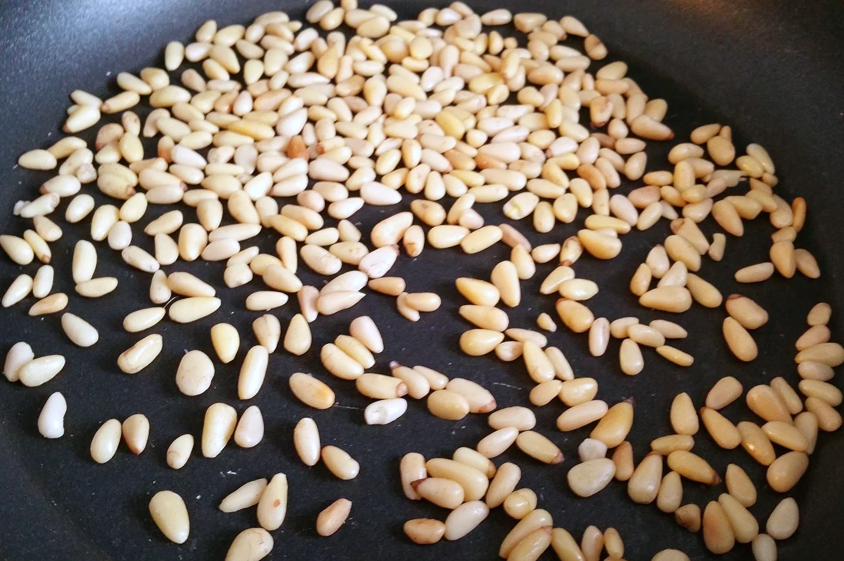 Rooster de pijnboompitten in een droge koekenpan en schud op een bord.