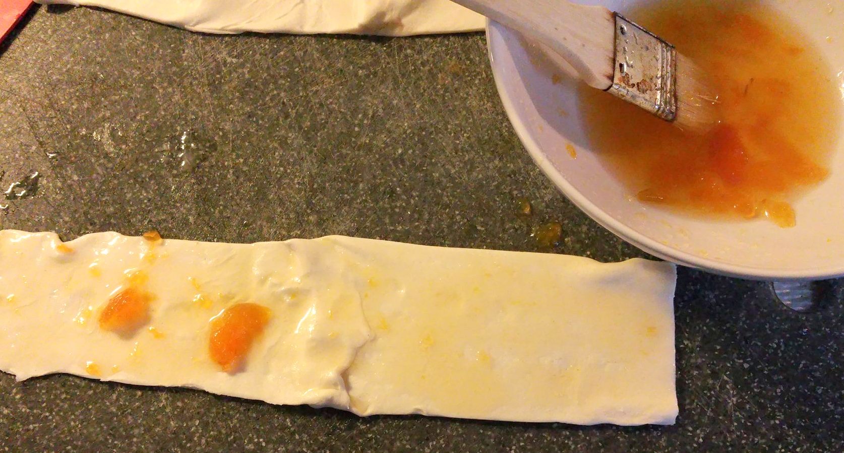 Meng de jam met een eetlepel water en beleg de deegstroken.