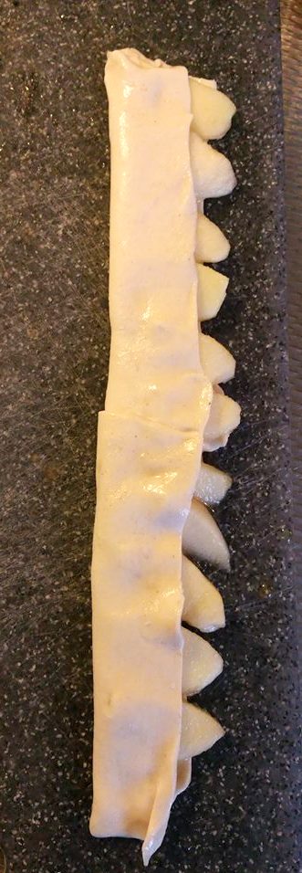 Vouw de deegstroken op de appelschijfjes.