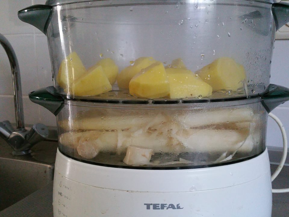 kook de asperges en de aardappelen in ruim water met zout of zoals hier in een stoom apparaat, 20 minuten.