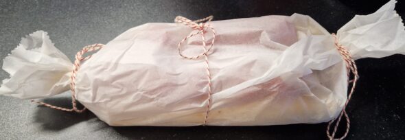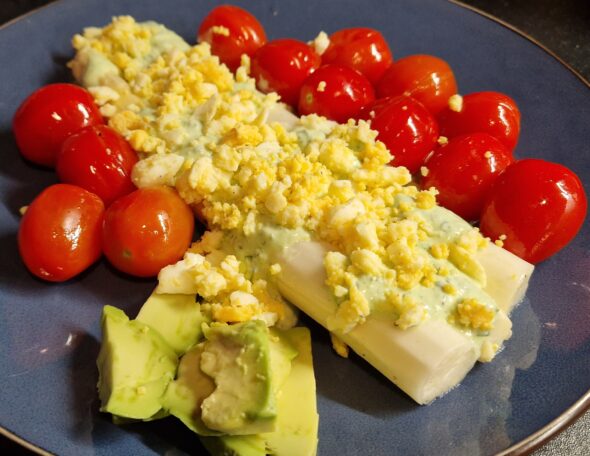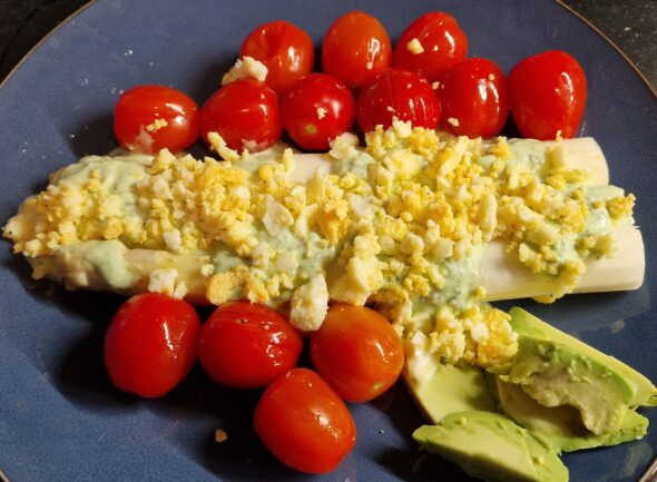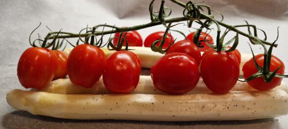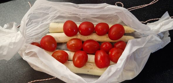 De asperges koken in hun eigen sap met tomaaatjes in papillote (pakketje).