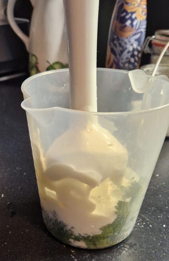 Mix het mengsel met een staafmixer tot een gladde saus.