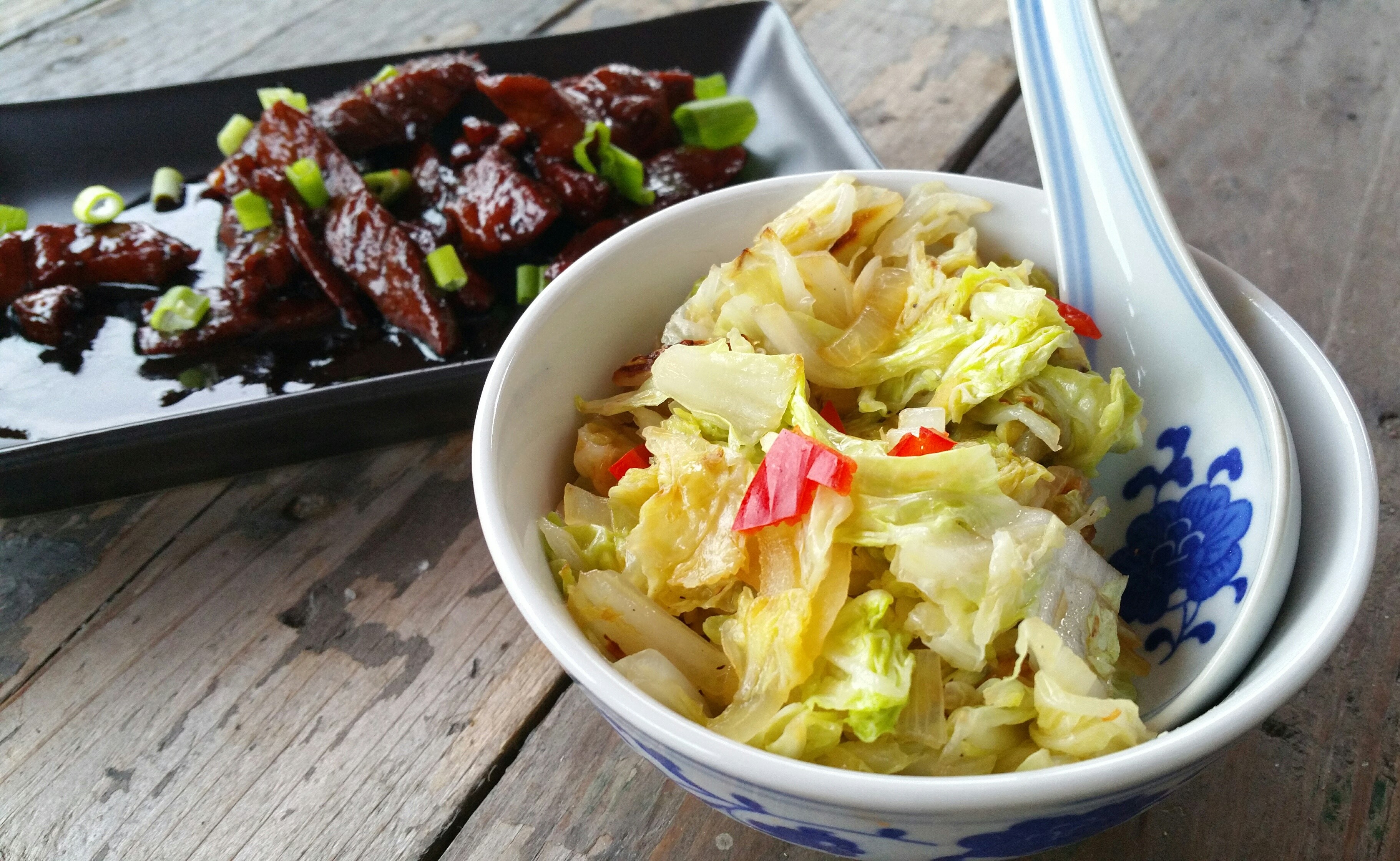 Voeg de kool toe en laat nog 4 min. meebakken.