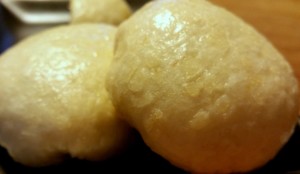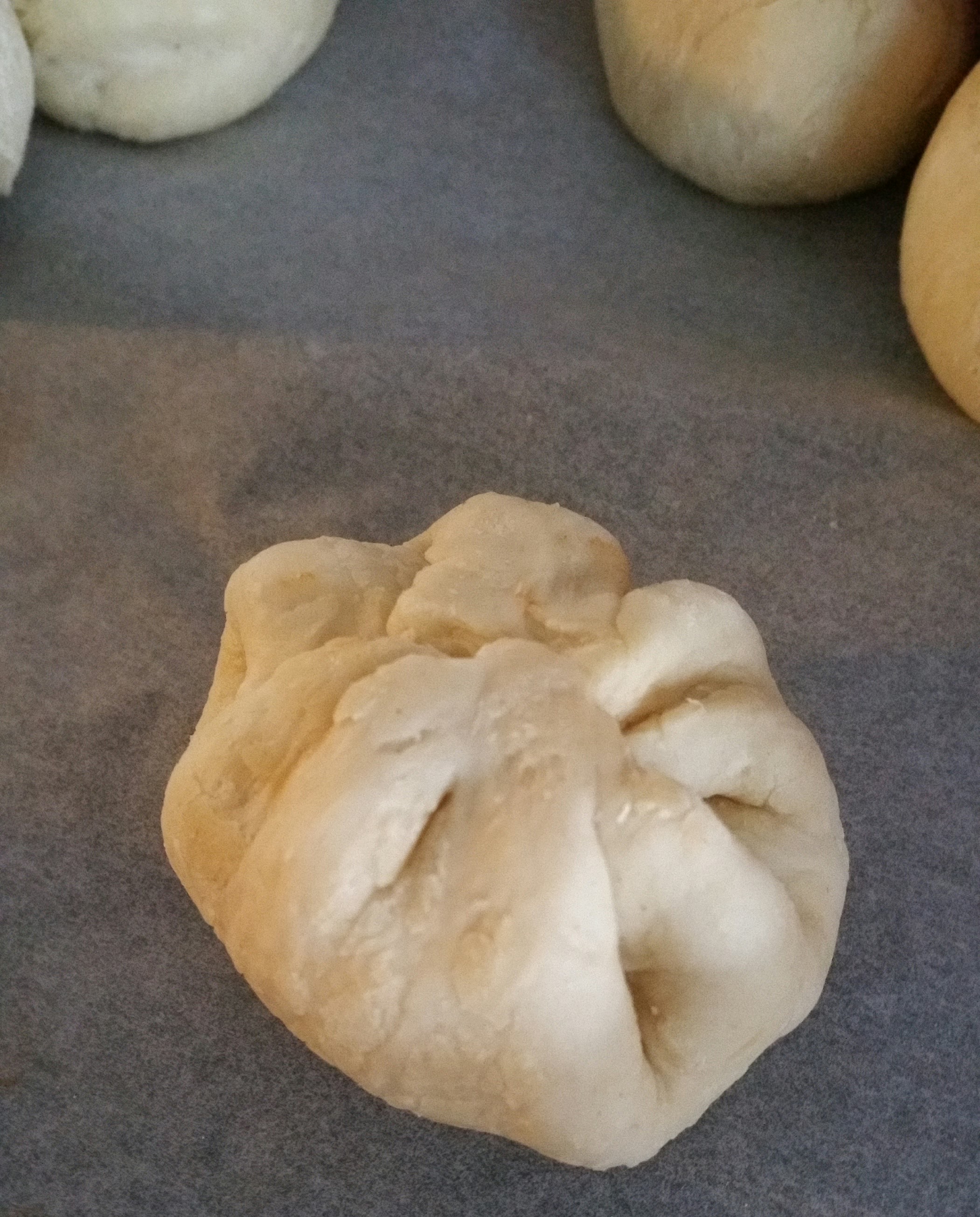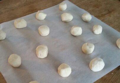 Snijd 16 stukjes (voor kleine broodjes) en maak er kleine balletjes van.