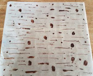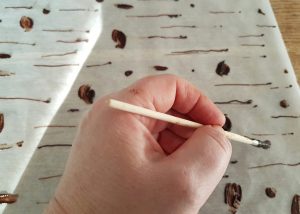 Teken met een kwast streepjes en rondjes op een heel vel bakpapier om een berkenstam afdruk te maken.