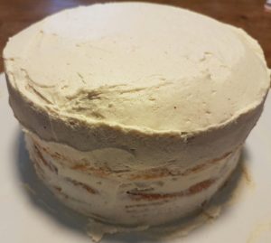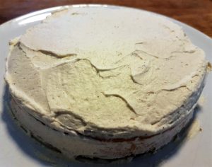 Smeer de vulling op de zijkant van de 3e biscuit bodem en strijk hem mooi glad.