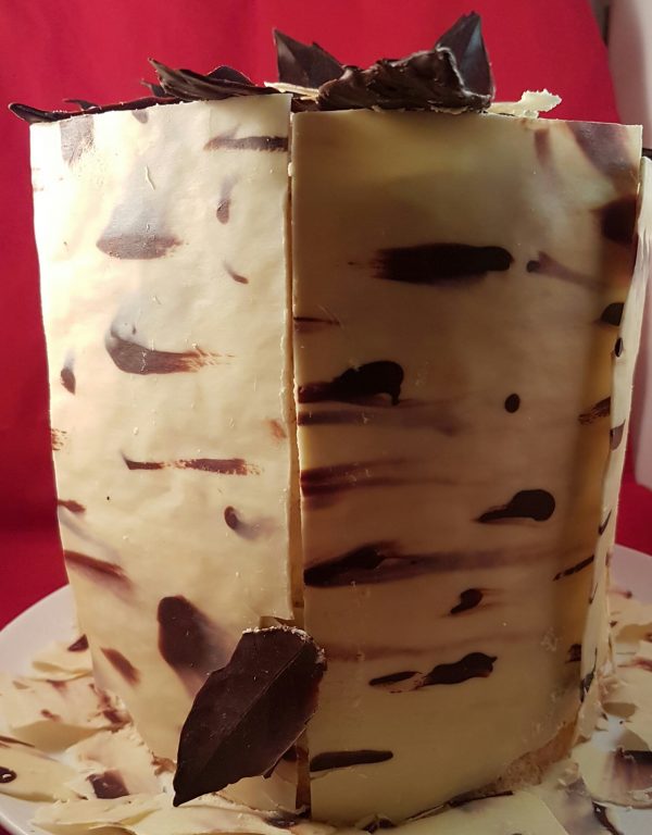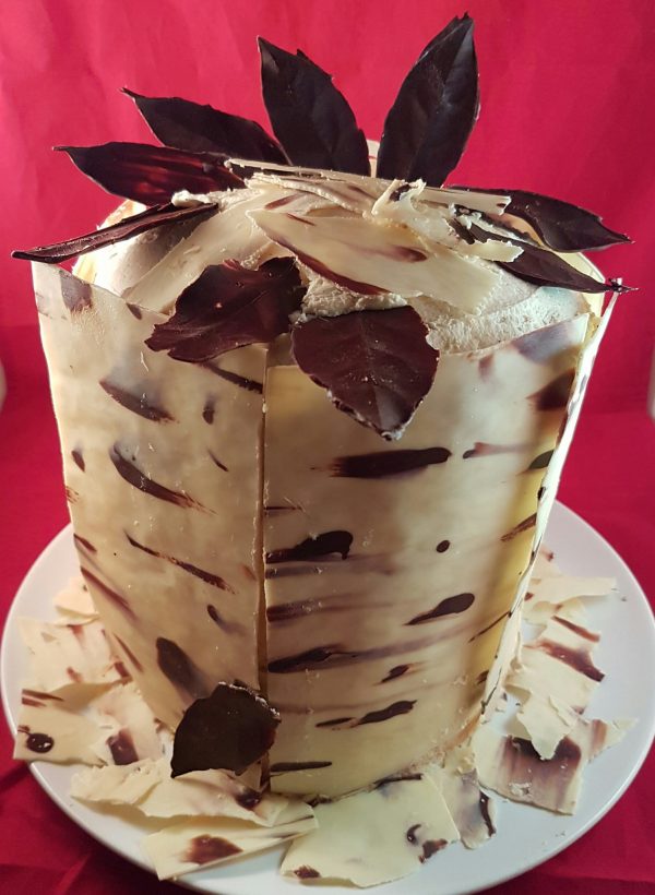 Versier de taart met de blaadjes en met kapotte stukjes berkenstam.