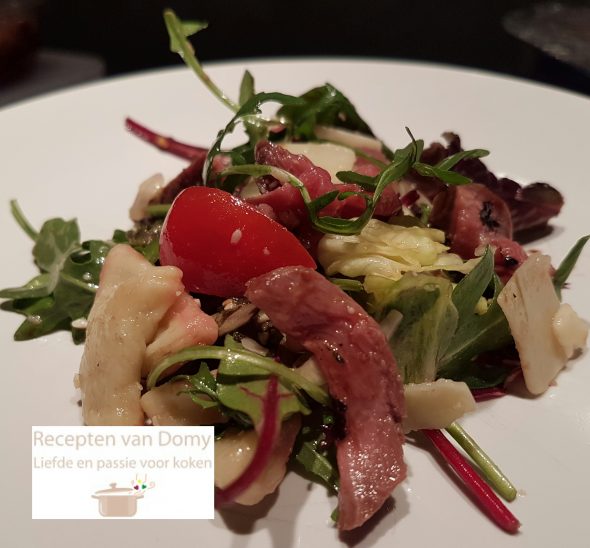 Snijd het vlees in plakjes van ½ cm en besprenkel met de helft van de dressing. Meng de andere helft van de dressing door de sla en tomaatjes en leg deze op de biefstuk. Schaaf de kaas erover.