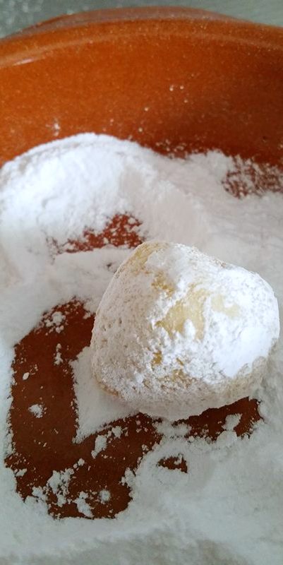 Dop ze ( rol ze erin ) een paar een, eerst in de suiker en daarna in de poeder suiker.