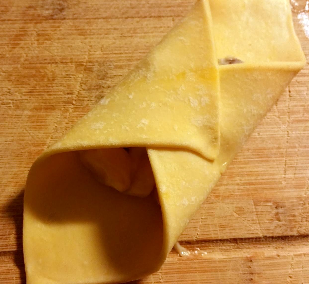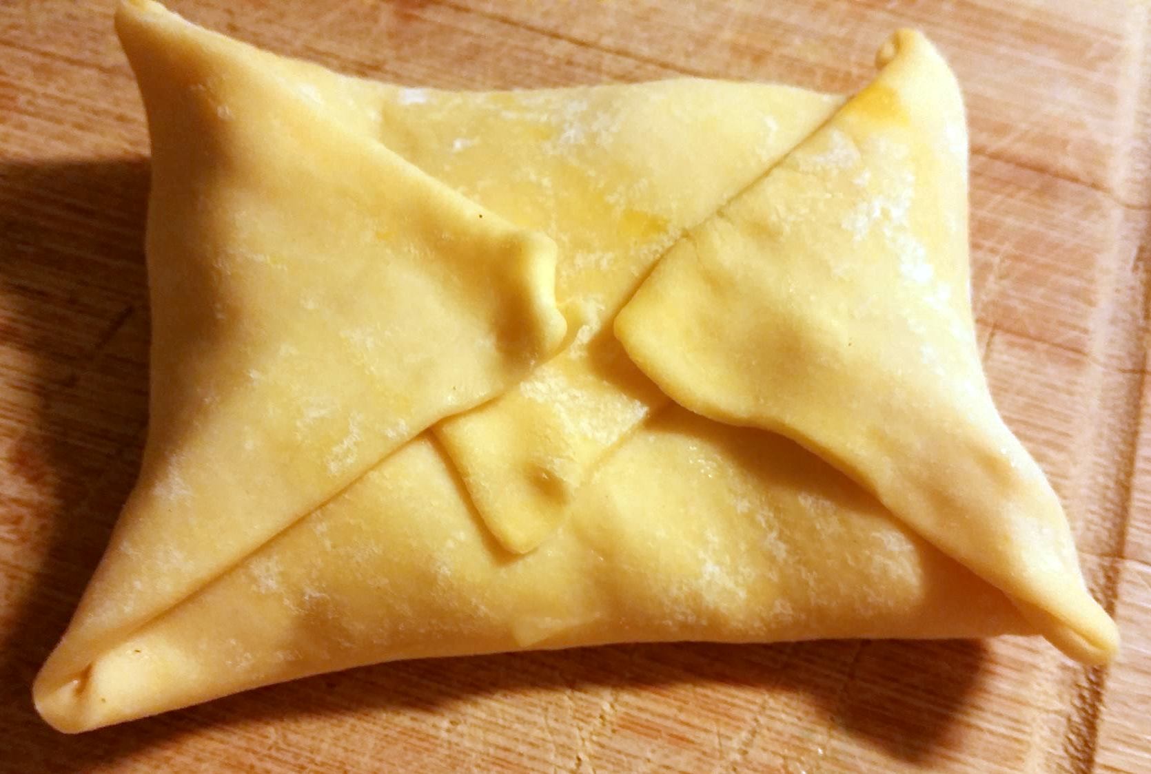Vouw het bladerdeeg op en leg het bladerdeeg pakketje op een rooster bekleed met bakpapier.