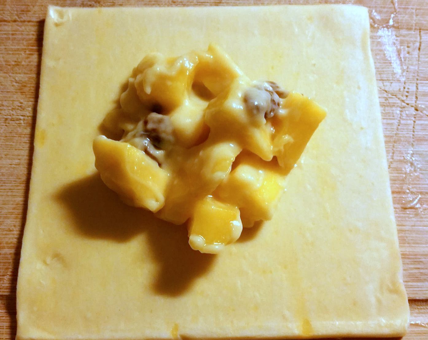 Leg 2 eetlepels van het mango mengsel op een bladerdeeg vel.