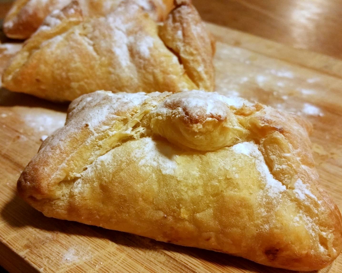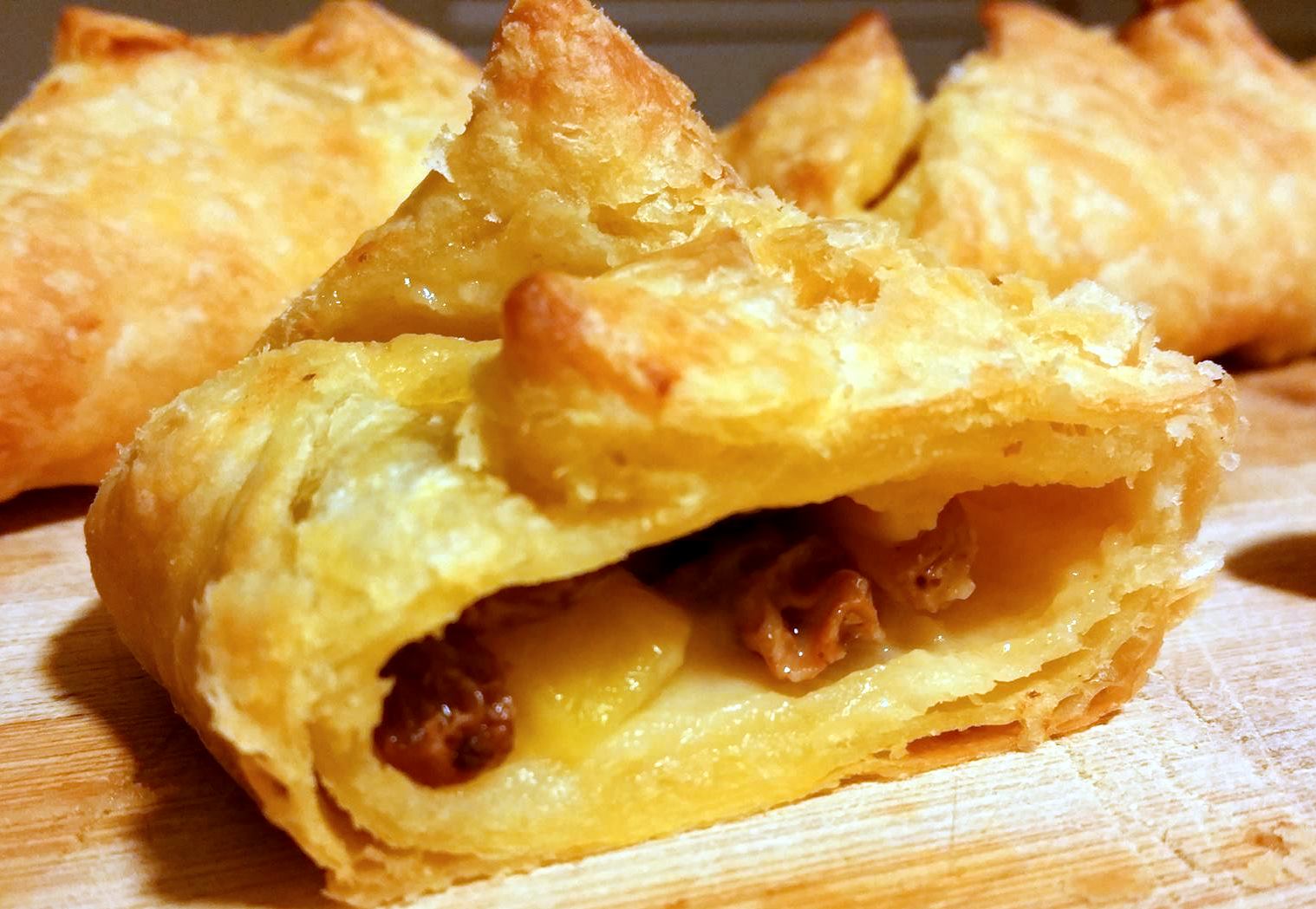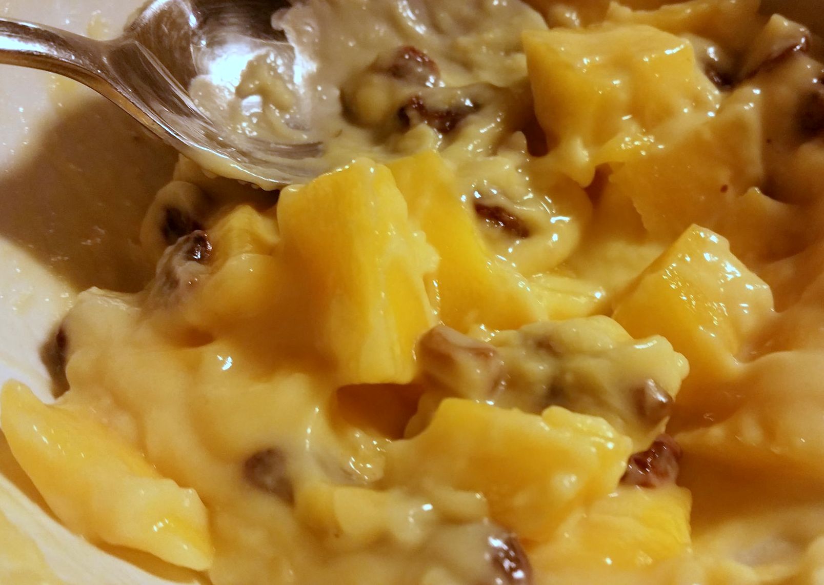 Zelf verzonnen recept van bladerdeeg gevuld met mango, rozijntjes en een heerlijke sinaasappel custard.