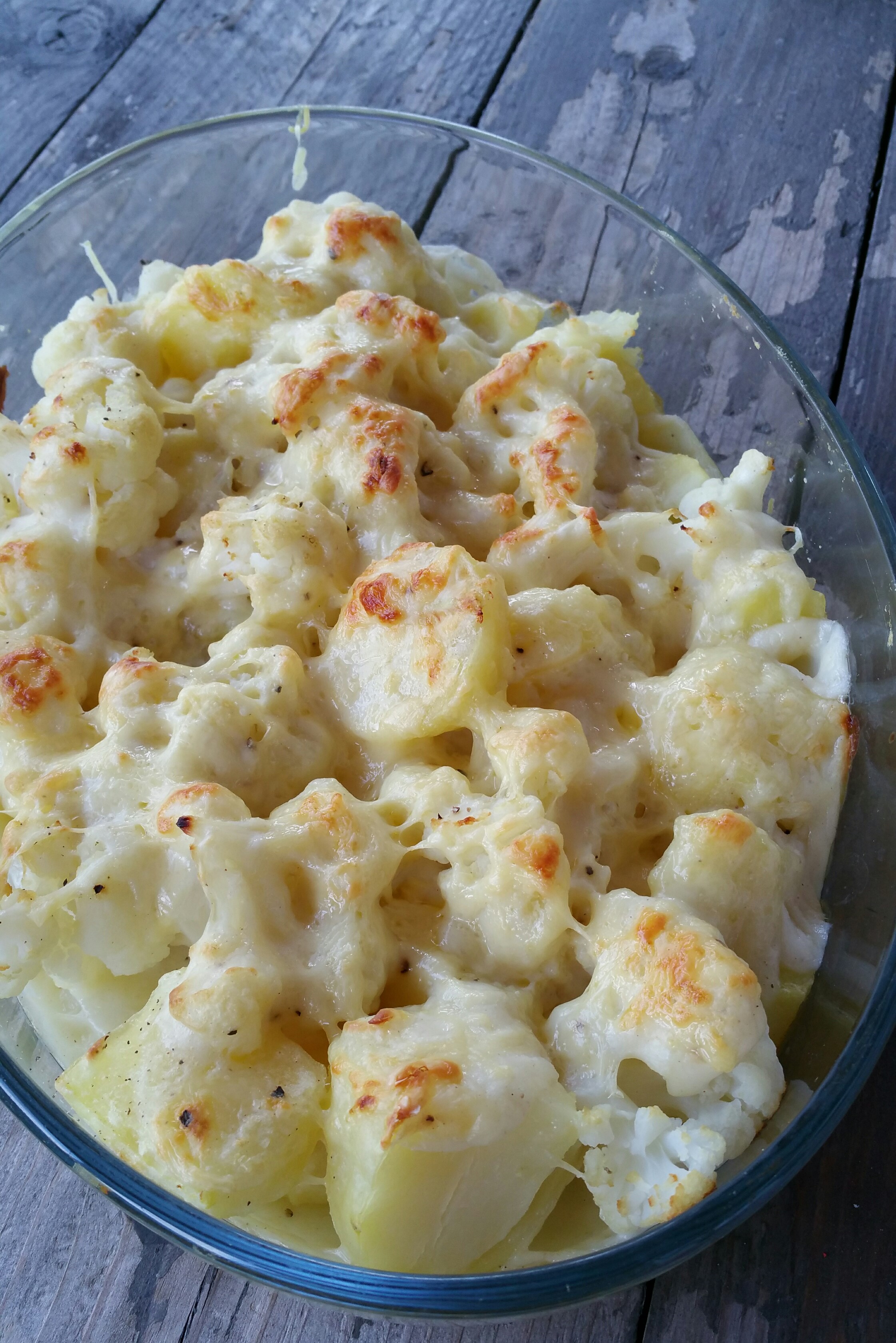 Snijd de bloemkool in roosjes ,de aardappelen in blokjes en kook deze in water met zout in 15 tot 20 minuten gaar.