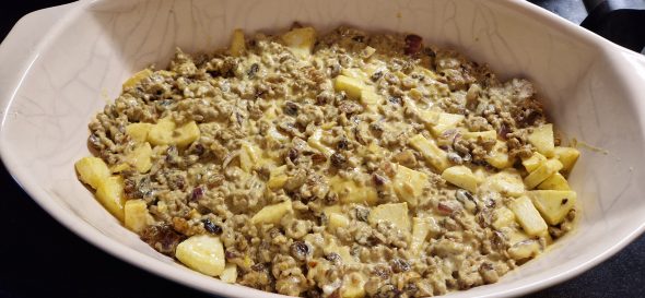 Voeg ze samen met de appel blokjes bij het gehakt toe.