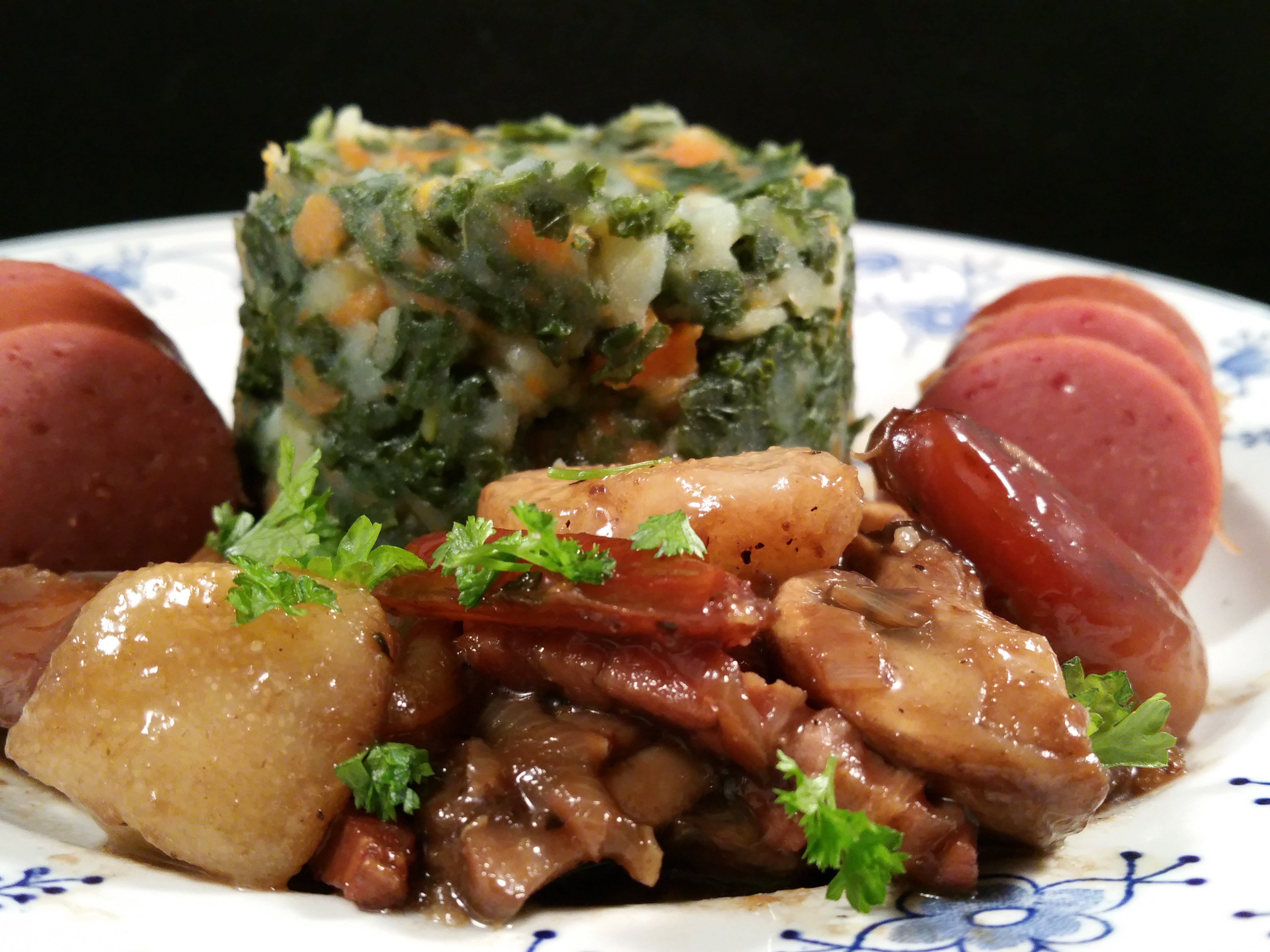 Stamp de boerenkool- aardappelen-wortels samen tot een mooie puree.