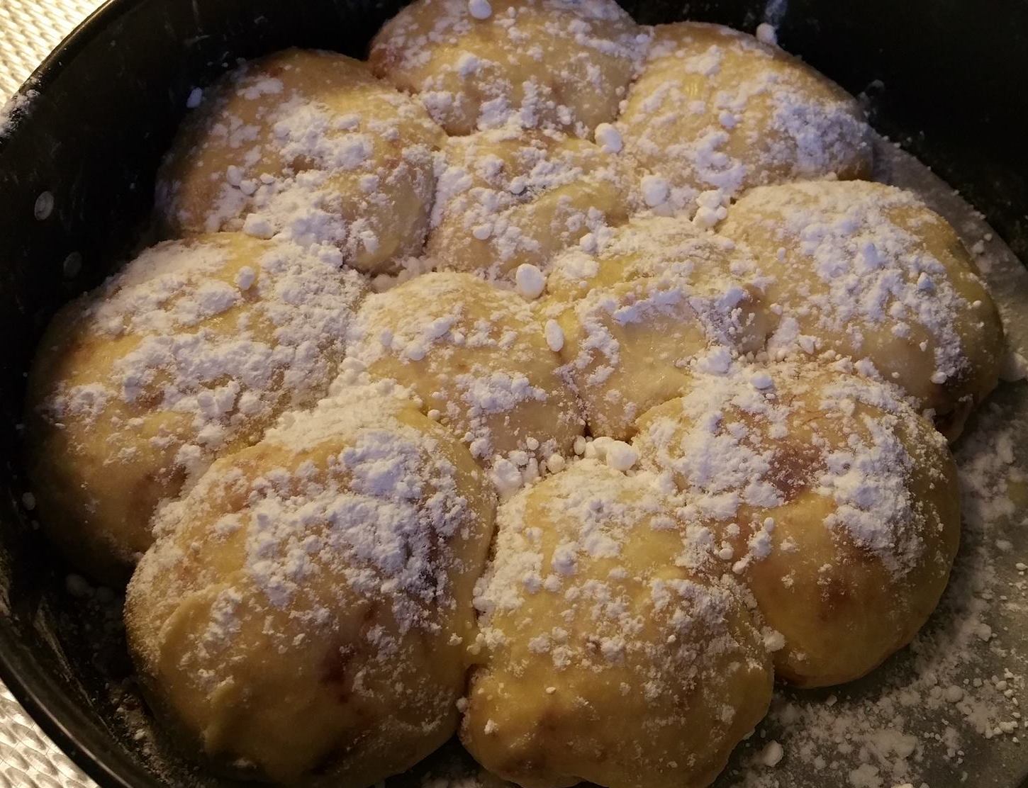 Laat de rest van de boter smelten, bestrijk er de brioche mee en strooi wat poeder suiker erover.
