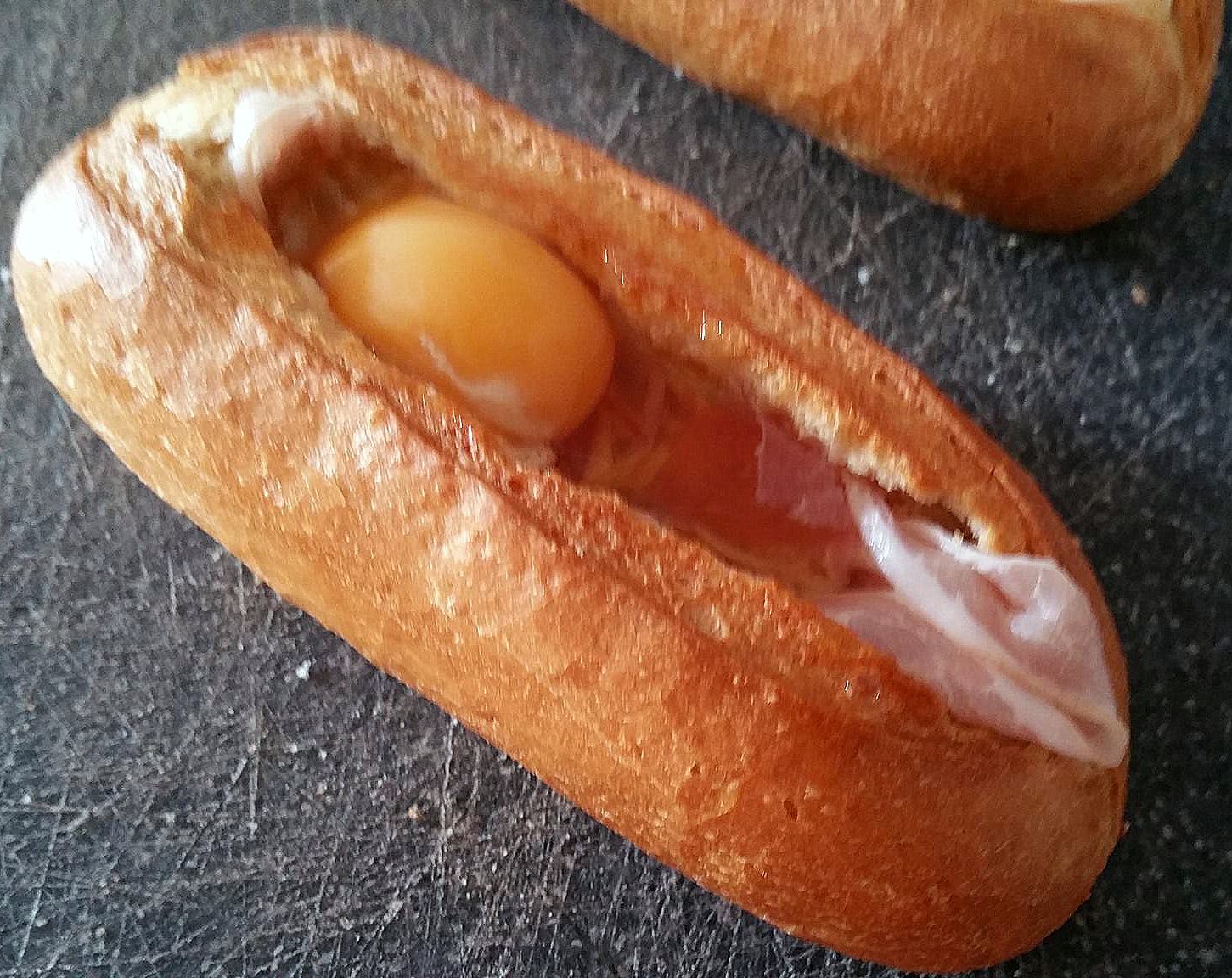 Breek het ei in het broodje, zorg dat de dooier heel blijft.