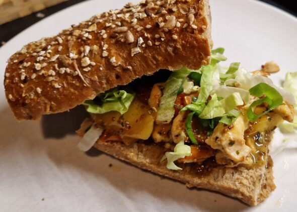 Heerlijk broodje kip met gebakken appels en met een zelfgemaakte honing en mosterd saus!