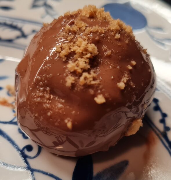 Met 2 theelepels dop een balletje in de chocolade, tot het goed bekleed is.