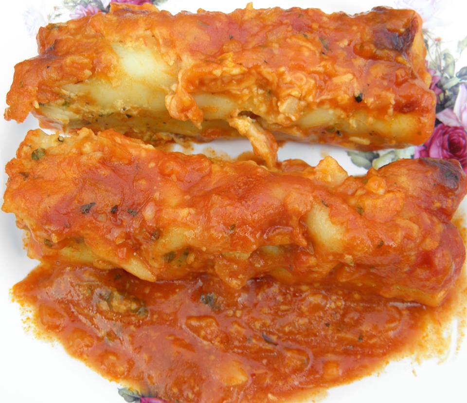 Vul de cannelloni met het mengsel en leg ze naast elkaar in een ovenschaal.