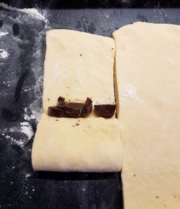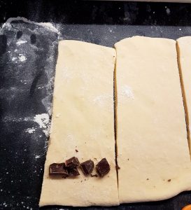 Vouw een beetje het deeg, doe 4 stukjes chocolade erop, vouw dan 1 keer, voeg nog 4 stukjes chocolade en vouw nog een keer.