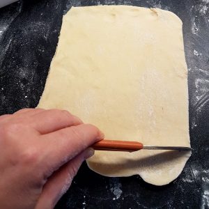 Snijd 3 lange strokken. Snijd de randjes netjes af.