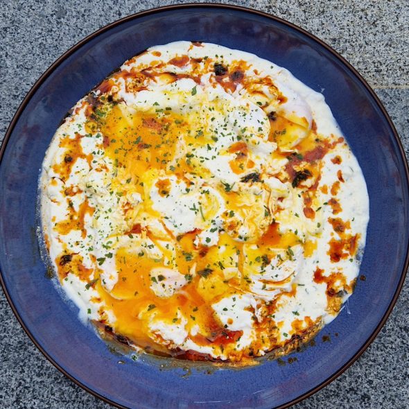 Çilbir is een traditioneel Turks gerecht bestaande uit gepocheerde eieren geserveerd op een bedje van yoghurt gemengd met knoflook en bedekt met gesmolten boter verrijkt met paprika.