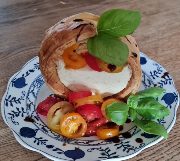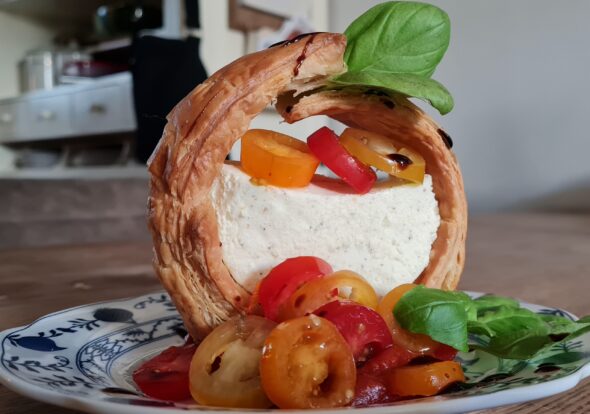 Een prachtige cirkel van bladerdeeg, een pannacotta van mozarella en basilicum, tomaatjes in verschillende kleuren en crema de balsamico.