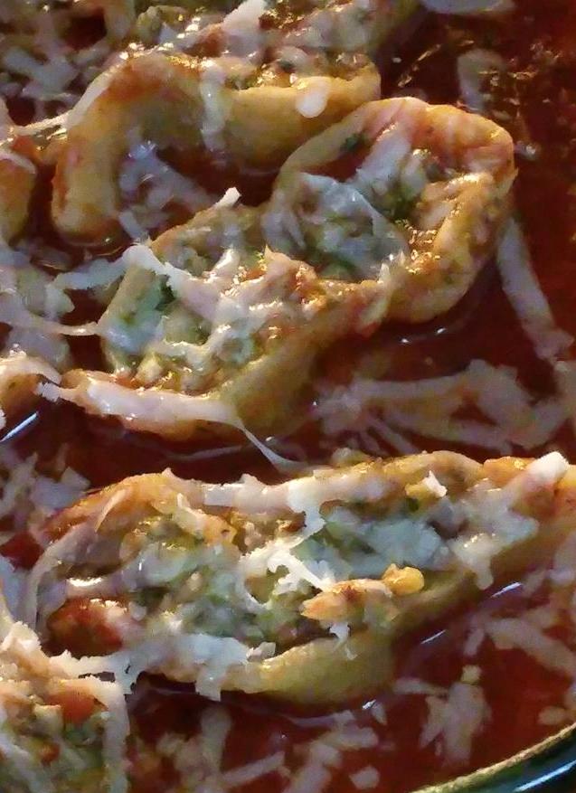 Antipasti recept van verse gemaakte pasta schelpen gevuld met pesto, ham en champignons in tomatensaus. zelf verzonnen.