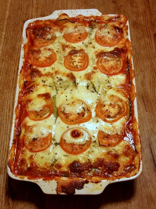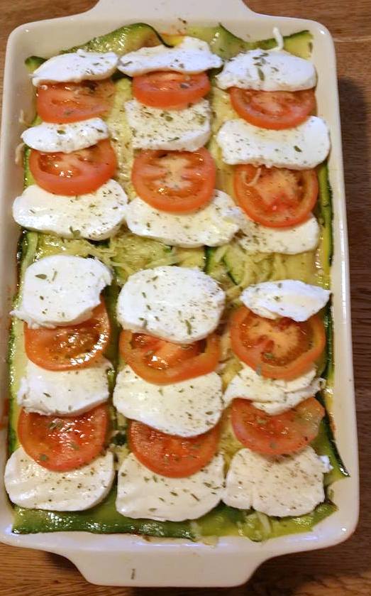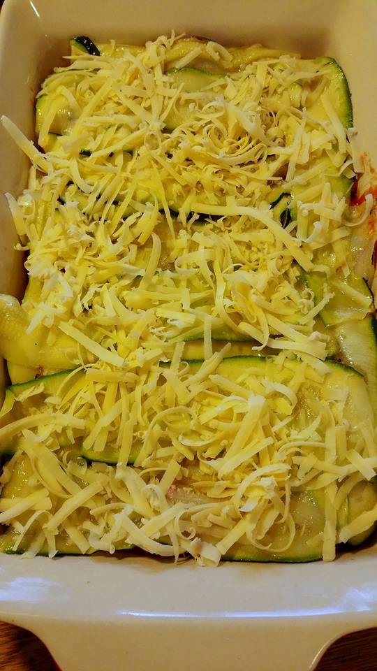 Zet de ovenschaal in de oven en bak de courgettes lasagne op 180 graden, 35 minuten.