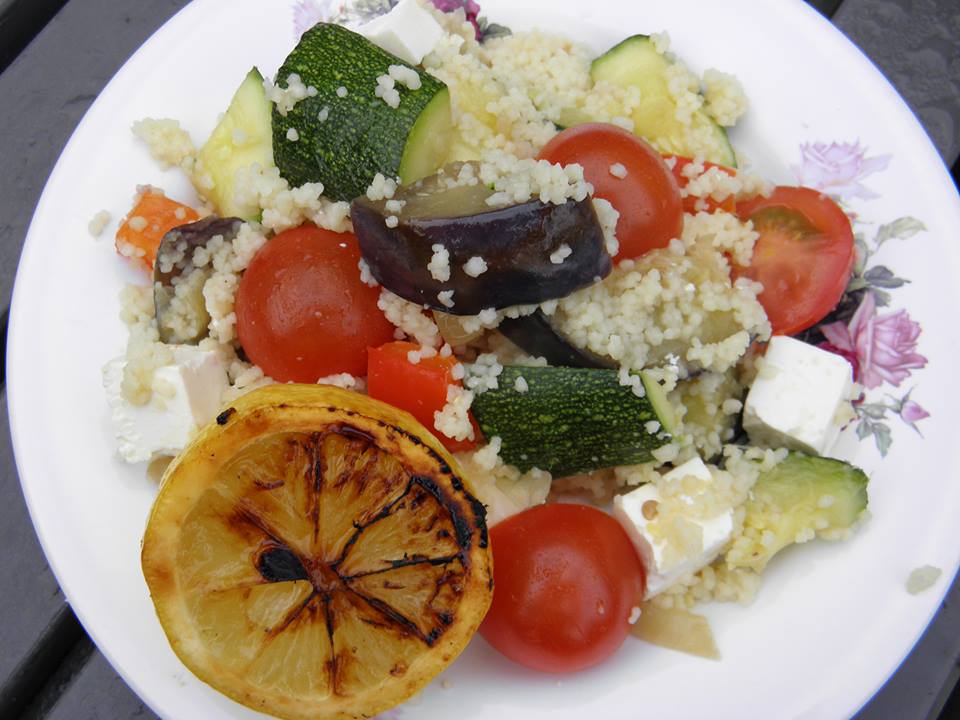 Meng de gegrilde groenten, tomaatjes, kaasblokjes, peper en eventueel zout door de couscous.