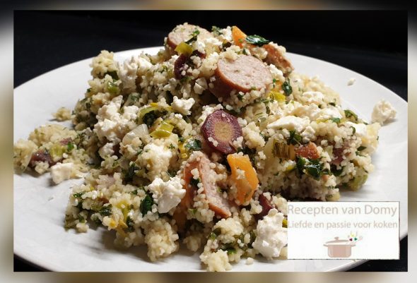 Snijd de feta in kleine blokjes en meng de helft met de couscous.